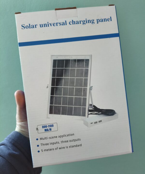 El Panel Solar Universal de Carga es ideal para alimentar y cargar dispositivos en cualquier lugar aprovechando la energía solar. Su diseño portátil incluye múltiples entradas y salidas USB, además de un cable de 5 metros para mayor comodidad. Perfecto para camping, viajes, exteriores o emergencias.